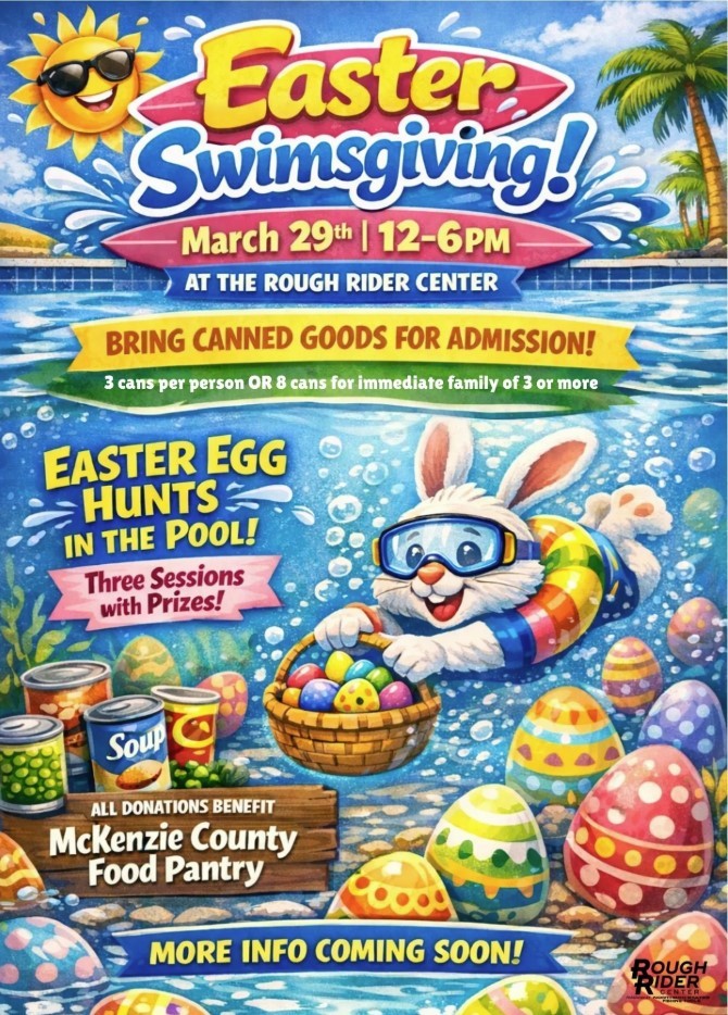 This fun, family-friendly event combines swimming and giving back to the community. Admission is a donation of canned goods, which will benefit the McKenzie County Food Pantry. Guests can enjoy open swim time and take part in exciting Easter egg hunts held right in the pool, with three hunt sessions and prizes throughout the day.